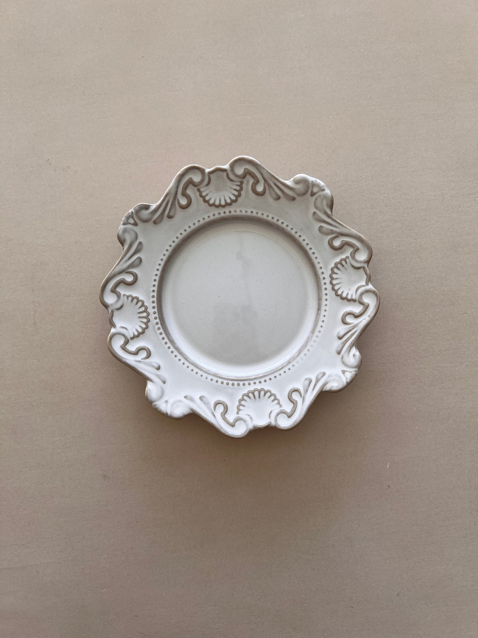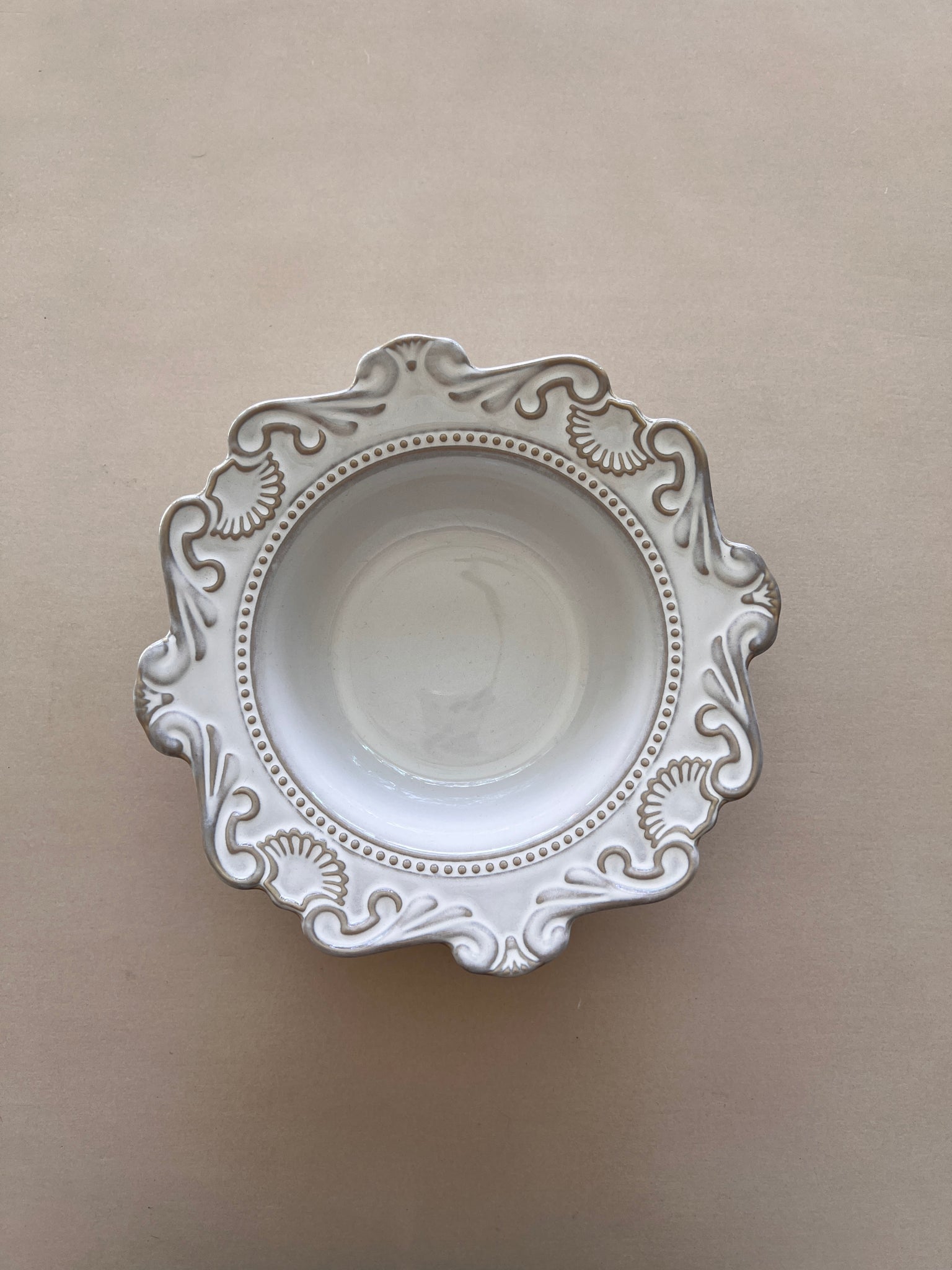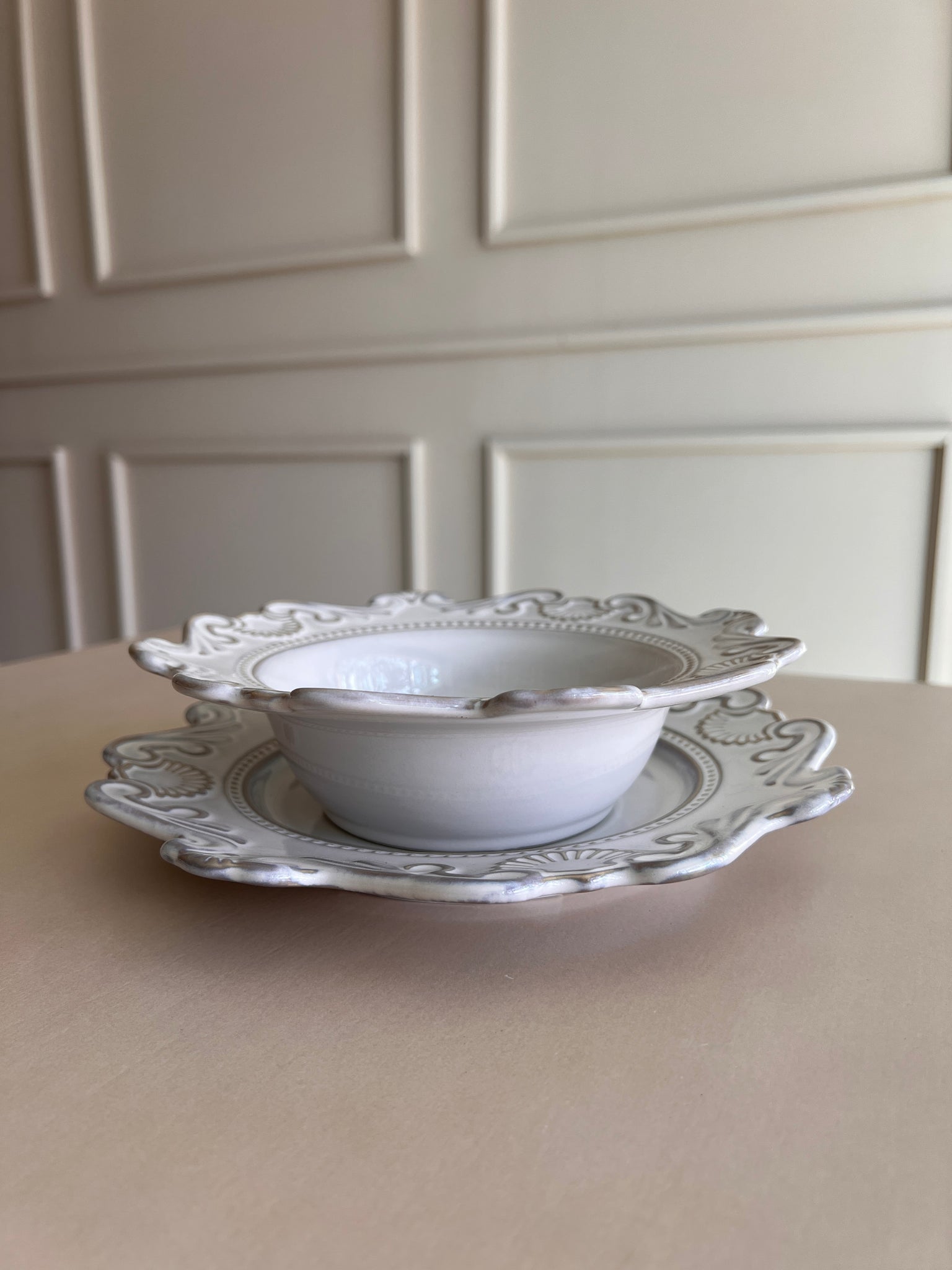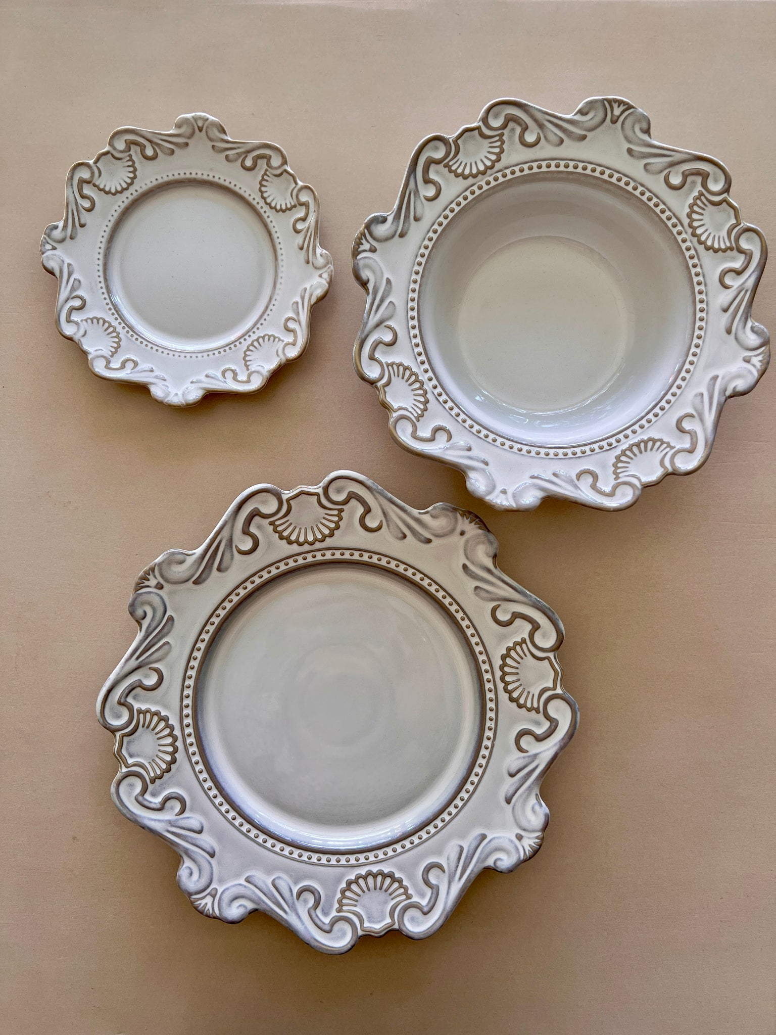 La Vajilla Barroco destaca por su diseño ornamental inspirado en detalles clásicos, que transforman cualquier mesa en un espacio sofisticado y lleno de encanto. Sus relieves decorativos y acabado en cerámica dan como resultado un set único y atemporal.