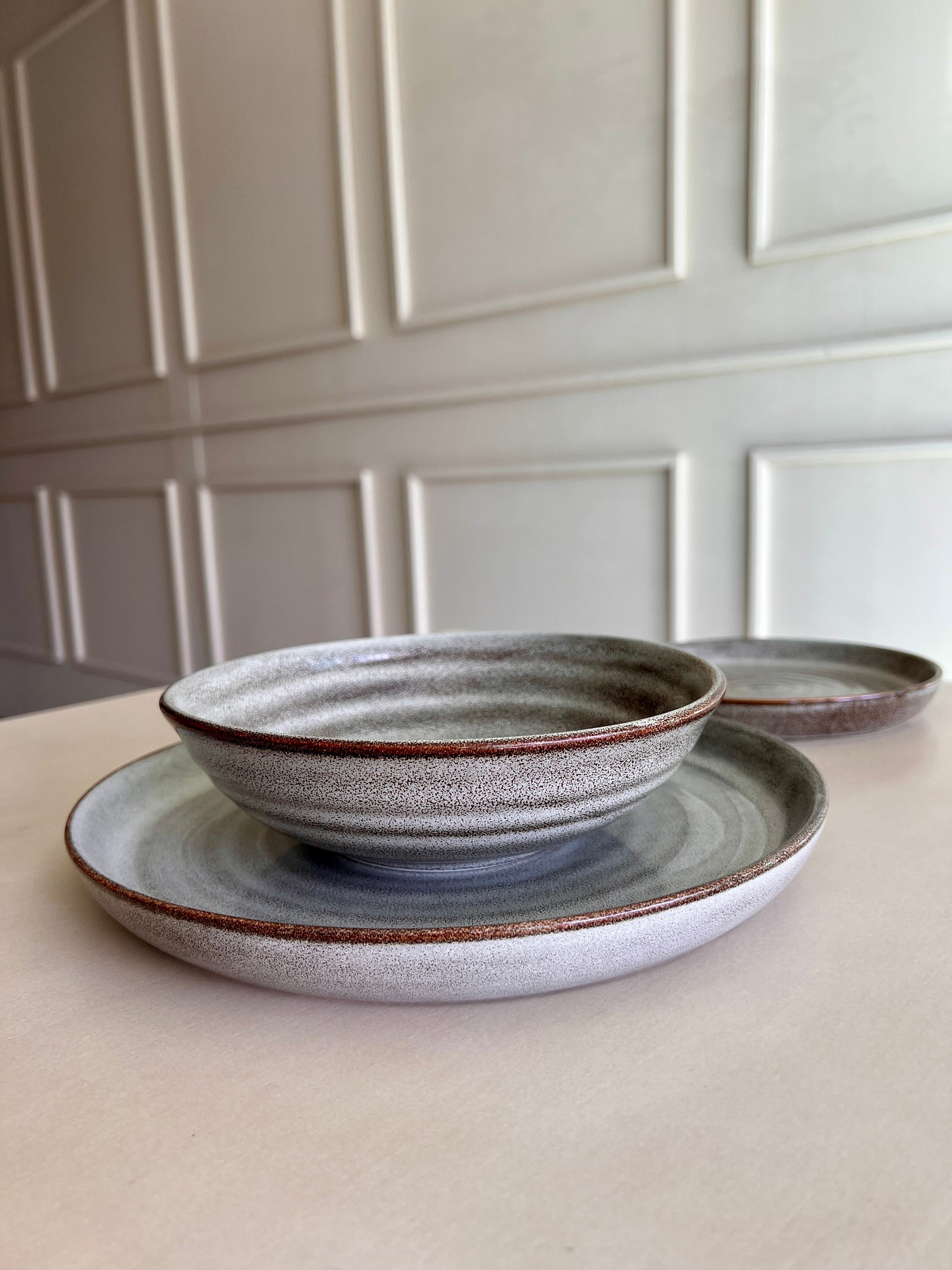Eleva tu mesa con esta vajilla de diseño moderno y acabado minimalista. Cada pieza combina tonos grisáceos con un borde café cálido que aporta textura, naturalidad y un estilo atemporal que se adapta a cualquier ocasión.